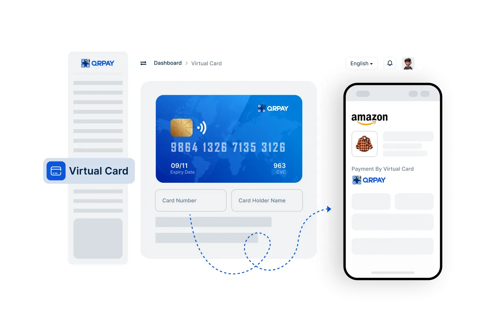 Avec la fonctionnalité de carte virtuelle de QRPay Pro, vous pouvez effectuer des achats en ligne sans révéler les détails réels de votre carte de crédit. Générez une carte virtuelle en quelques secondes et utilisez-la pour toutes vos transactions en ligne en toute confiance, sachant que vos informations financières sont protégées.